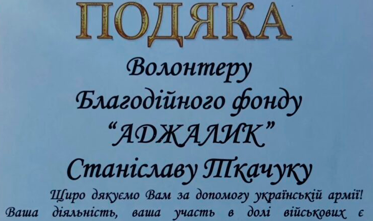 Волонтер БФ "Аджалик" в Одеській області Станіслав Ткачук отримав подяку